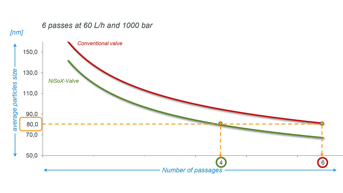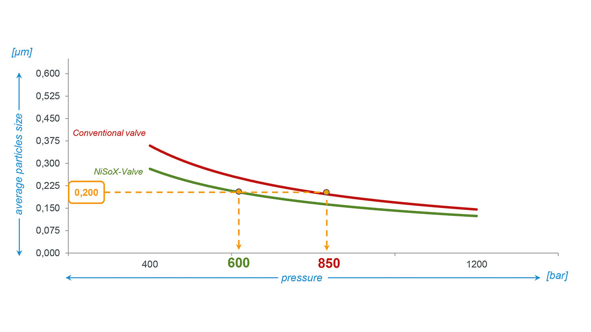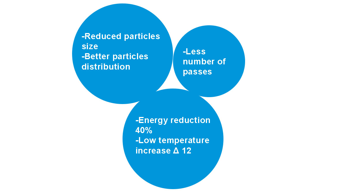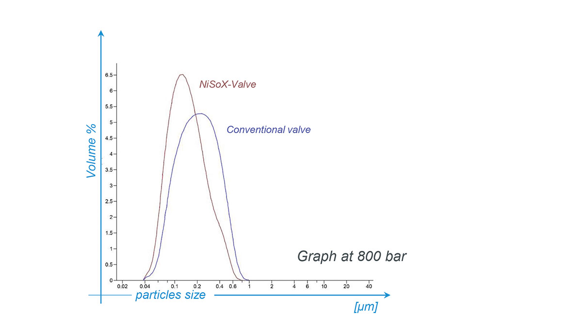Tests performed in some production plants clearly show how effective the NiSoX-Valve can be in regards of particles size reduction and uniform particles distribution; as a consequence also the number of passages at a given pressure can be reduced.