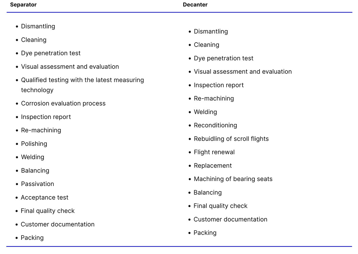 A special offering for separator repairs is the GEA Fast Lane Service, which allows separators to be repaired in less than 10 days, depending on requirements – an optional service available at extra cost especially for very urgent and/or important cases. This service is offered for centrifugal separators in all application areas with a surcharge based on bowl diameter.