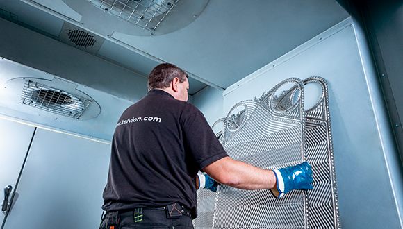Kelvion welded plate heat exchangers, with their outstanding thermal transfer coefficients, are built for demanding applications. To avoid any risk of unscheduled downtime, it is important to inspect the condition of the equipment to offset any potential failure before it happens. We provide a range of preventative measures, including cleaning by hydro-blasting, chemical CIP and inspecting and repairing welding. Should the heat exchanger fail, we will first collect data to assess the damage then our service engineers will perform a range of tests. We always advise you not to try and open the heat exchanger – particularly a K⁰Bloc unit – without training or Kelvion supervision as this may cause further damage if done incorrectly.
